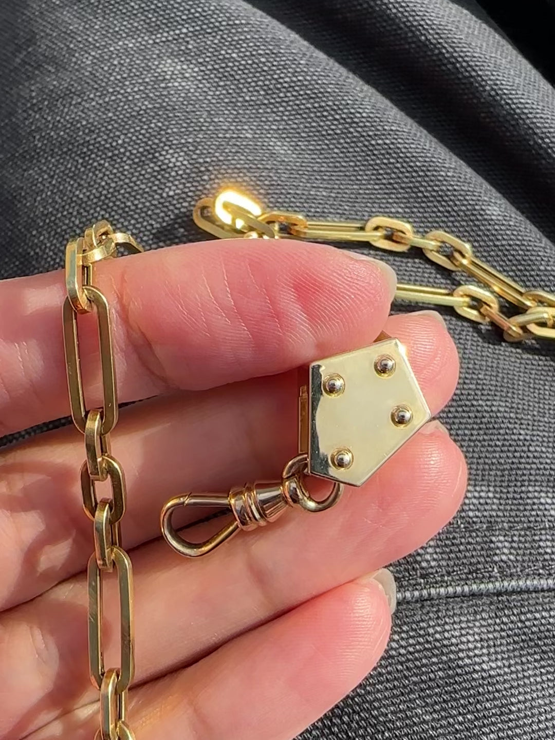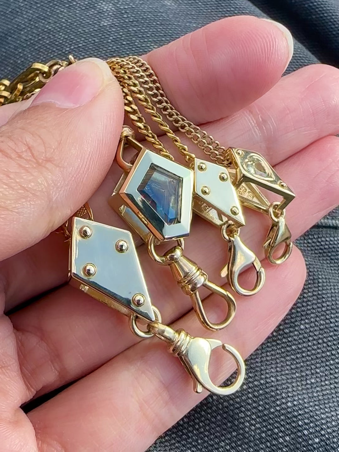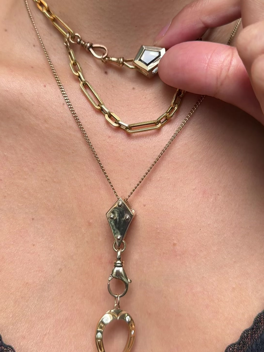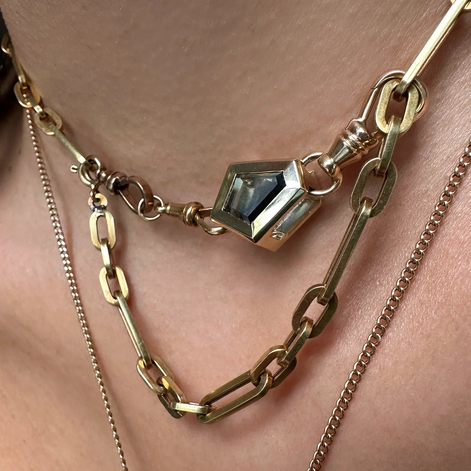 From a classic chain slide-through to creating chain collars, Victorian drapes, or your own chain stacking silhouette, the Crane Blocks are the new essential piece meant for endless chain and charm stacking options. Designed with multiple compartments, securely string chains on the tops, sides, and clip your charms to create a personalized stack. However you decide to use the Crane Block Enhancer, we can guarantee no one will style their neck stacks like yours. Made in very limited runs from carefully sourced vintage clasps.